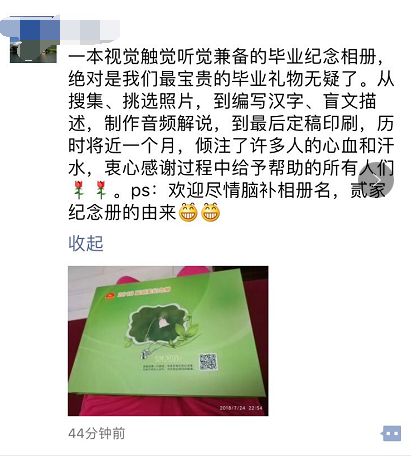 感謝所有為“盲文畢業(yè)紀(jì)念冊”做出奉獻(xiàn)的人,因為你們,世界更美麗。掃描封面二維碼,聆聽2018屆貳家畢業(yè)班同學(xué)的校園故事,不知不覺,熱淚盈眶,感動之余,我明白了“讓印刷走進(jìn)千家萬戶,為幸福生活添色加彩”的真實含義。